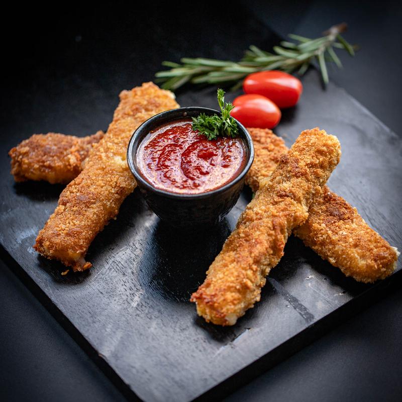 Fried mozzarella served with tomato sauce.